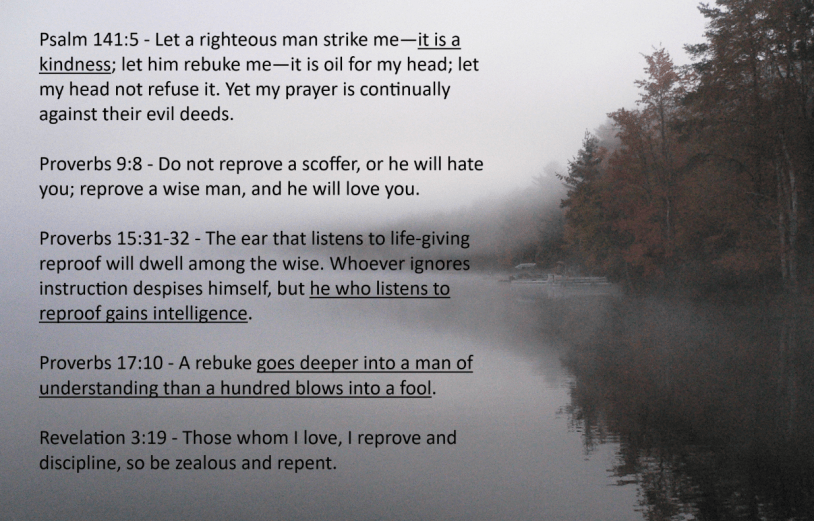 Proverbs 15:31-32 (ESV) – “The ear that listens to life-giving reproof will dwell among the wise. Whoever ignores instruction despises himself, but he who listens to reproof gains intelligence.”