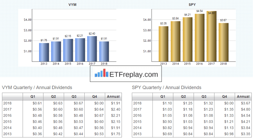 - The portion of the tool in the snapshot above does not tell you the dividend yield or expense ratio. In this case the yield for VYM is higher than that for SPY. If you are looking for income, then VYM may be a better choice for yield. You can see the dividend yield in the top graph: