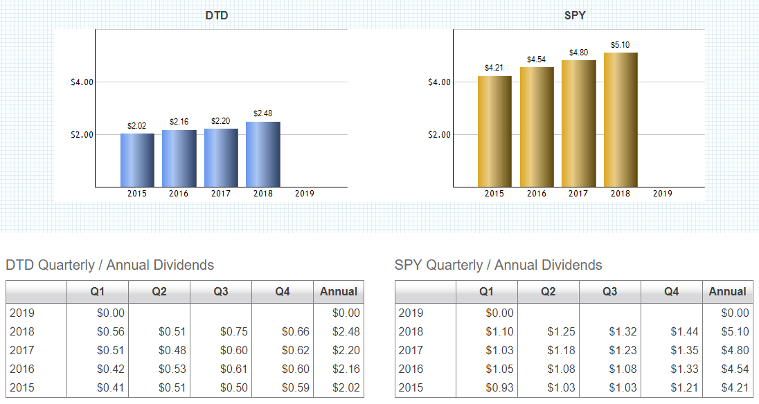 DTD is not an ETF I own, but I like many of its characteristics. The secret of success is to buy with a long-term perspective and reinvest the dividends. Compare DTD with SPY for dividend growth. Notice the areas in green.