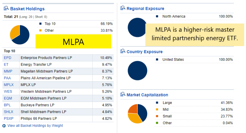 Energy is actually a very broad classification. One subset of the energy sector includes “master limited partnerships.” These are called MLP’s or “Limited Partnerships.” In fact, if the company has “LP” in its name, it is a limited partnership. Be careful about adding MLPs to your tax-deferred accounts. This can create an income tax nightmare. In fact, Fidelity Investments will charge you for the work they have to do to create the reporting you will need if you buy them in your IRA or your Roth IRA. MLPA doesn’t cause that problem.