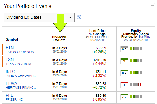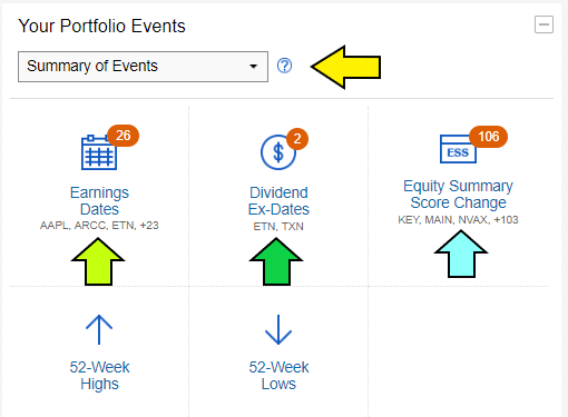 There are three views worth noting. The first is the default “Summary of Events” view. This view shows you positions where earnings will soon be announced (including AAPL, ETN) and the dividend ex-dates that are for today (ETN, TXN) or the near future. The third is the “Equity Summary Score Change.” I use the first two, but generally disregard the changes in the equity scores because I am investing for the long term and don’t care what the current “experts” think about each investment. Investments can go in and out of favor in the short term, and that doesn’t really help me.