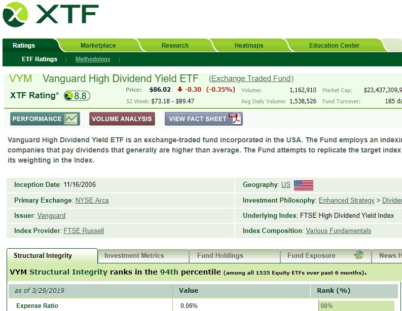A cardinal rule of investing, is “buy what you know.” In order to know something about an ETF, use the resources at XTF to expand your knowledge before you buy. Here are some samples from XTF’s review of VYM: