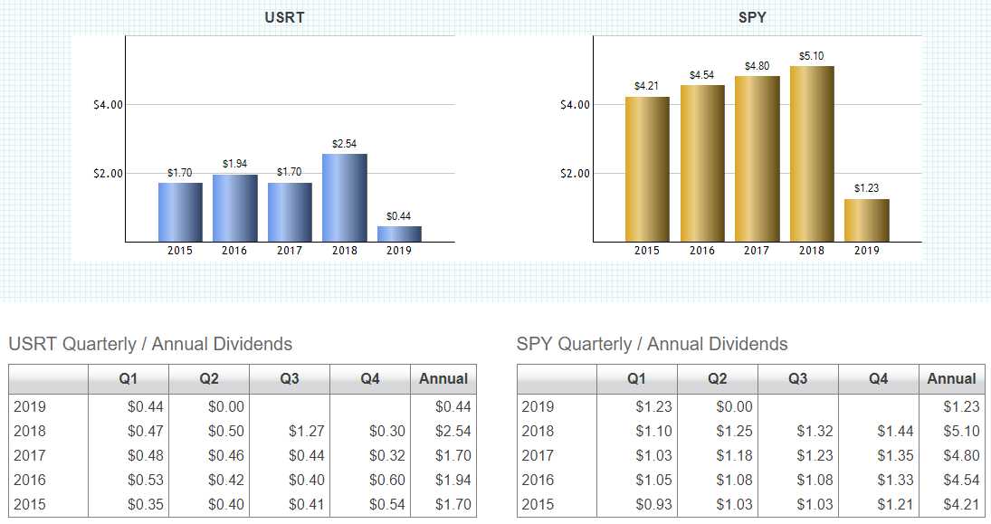 The expense ratio for USRT is sensible, and the current yield is respectable. However, it would be a mistake to view this as a dividend growth investment. 2017’s total dividend was less than the 2016 dividend, but 2018 recovered nicely. It is difficult to know what 2019 will look like. Real estate can be volatile.