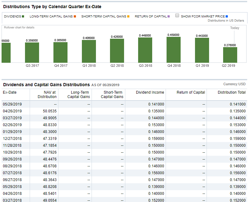 In addition to losing value, the bond ETF can also have varying income. One of the five, FCOR, has income that varies as shown in the following illustration. You will find this to be true of most, if not all bond ETFs.