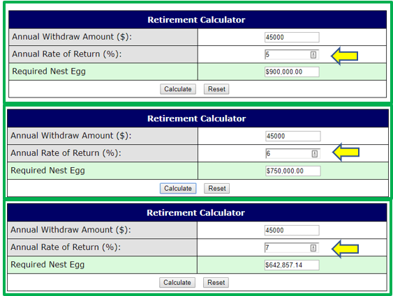 If you want to have an income of $45,000 per year, before taxes, then you need to have $900,000 saved by the day you retire. You need to average 5% returns (Annual Rate of Return: ARR) on your investment nest egg. If you achieve this, you will never have less than $900,000 in your account. Of course, your nest egg will go up and perhaps even down, but this is a good way to see the power of the annual rate of return. By the same token, by simply increasing your ARR to 6%, you then only need $750,000. And if you can achieve 7% ARR, then you need about $643,000.
