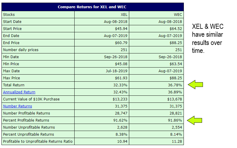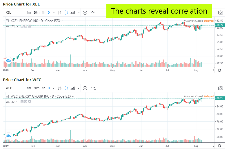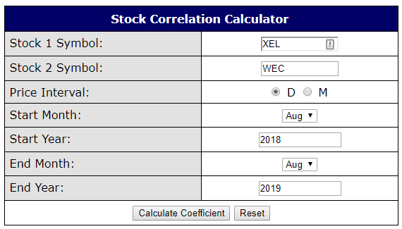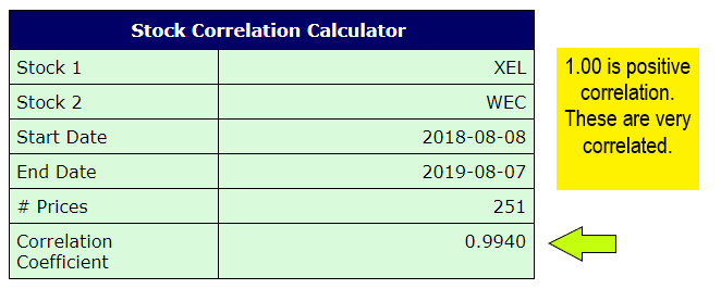 A stock correlation calculator can help you compare the histories of two different stock investments. For example, I own shares of several utilities. Two of them are WEC and XEL. The BuyUpside website (https://www.buyupside.com/calculators/stockcorrelationinput.php) has a stock correlation calculator.