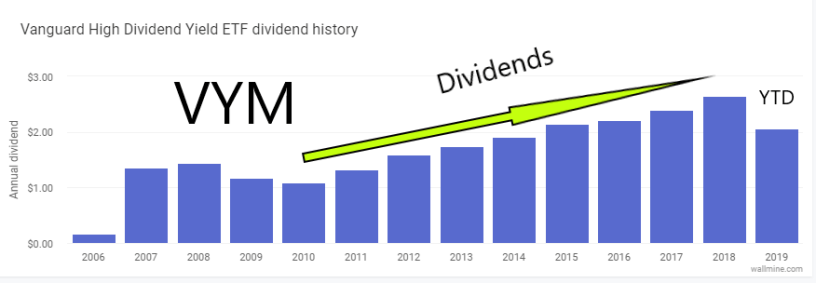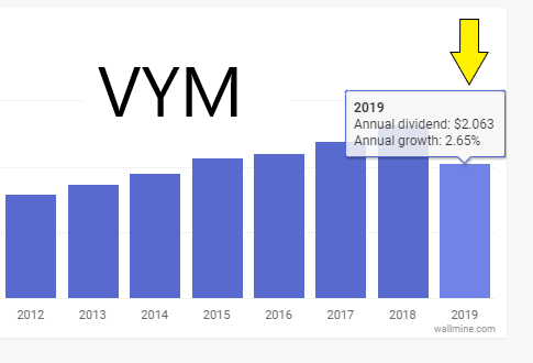 Because I have a substantial investment in ETF VYM, I experimented with that ETF in the Wallmine site. This is easy to do: just enter the ticker symbol in the upper left “Search for tickers” box and you will be given a nice screen that contains many helpful pieces. If you scroll down, you can see information pertaining to dividend yield and the five-year dividend growth rate. There is also a helpful dividend growth graph. You can hover over each bar in the graph to see the annual dividend amount and the dividend growth percentage.
