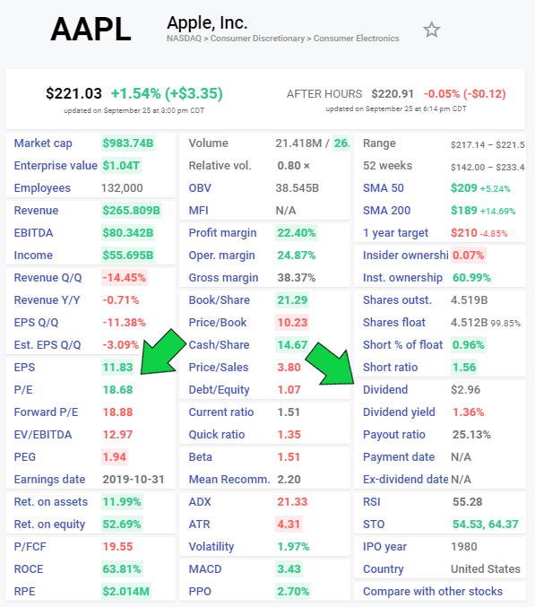 If you don’t know the ticker symbol, you should be able to find it by starting with a company name. For example, if you type “Apple” in the search box you will see several choices, including Apple, Inc (AAPL) and Apple Hospitality REIT, Inc (APLE). The information for a stock includes far more data points for the serious investor.