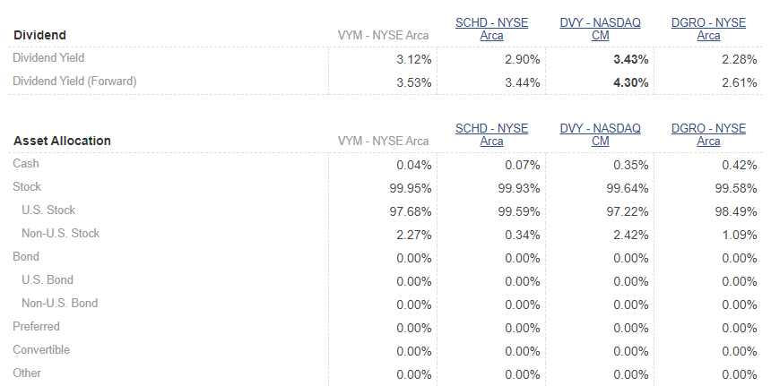 The performance over five years would put DGRO on top. But DVY has the best current dividend yield. But is the expense ratio eating into the yield? DVY has a higher expense ratio, the highest of the three. VYM and SCHD have the most investor-friendly expense ratios. For turnover, I think VYM is a better choice for less churn of the stocks in the fund. None of these is terrible, so to increase diversification, using two or more of these four can be a good long-term strategy. VYM has 405 holdings, SCHD has 100, DVY has 100 and DGRO has 476. It is likely that VYM and DGRO hold many of the same investments, but all four are large cap value ETFs. An argument could be made that DGRO is the best choice.