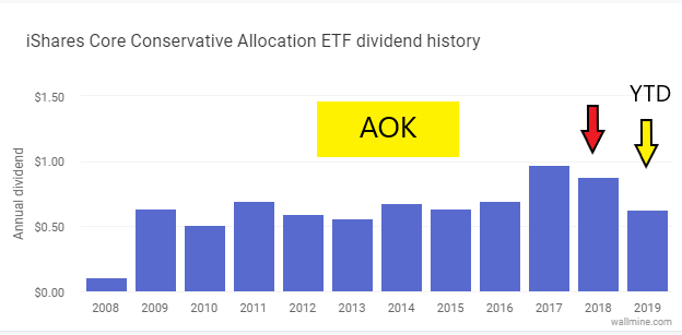 AOK’s complexity is puzzling. It is an ETF that holds other iShares ETF’s and most of the holdings are bonds. One is IUSB and the other is IAGG. This sounds smart but is unnecessary and costly. AOK’s expense ratio is significantly higher than the expense ratios of IUSB and IAGG. Given the reality that AOK is 71% bonds, I must ask, “why not just buy IUSB and then shares of IVV?” You will wind up with essentially the same results at a far lower annual cost. Always understand holdings in an ETF or mutual fund before you buy it.