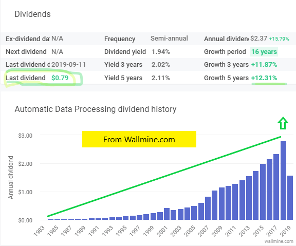 This morning I see that ADP (Automatic Data Processing, Inc) raised the dividend by 15.2%. ADP provides cloud-based human capital management solutions worldwide as an information technology software and services company. Earnings are growing, dividends are growing, the payout ratio is very good, and I think the company has a good moat because customers don’t easily switch from one technology solution to another without high costs. So I get an automatic pay raise from Automatic Data Processing.