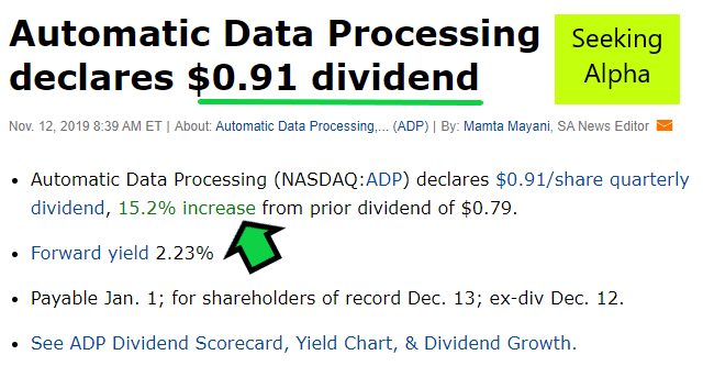 This morning I see that ADP (Automatic Data Processing, Inc) raised the dividend by 15.2%. ADP provides cloud-based human capital management solutions worldwide as an information technology software and services company. Earnings are growing, dividends are growing, the payout ratio is very good, and I think the company has a good moat because customers don’t easily switch from one technology solution to another without high costs. So I get an automatic pay raise from Automatic Data Processing.