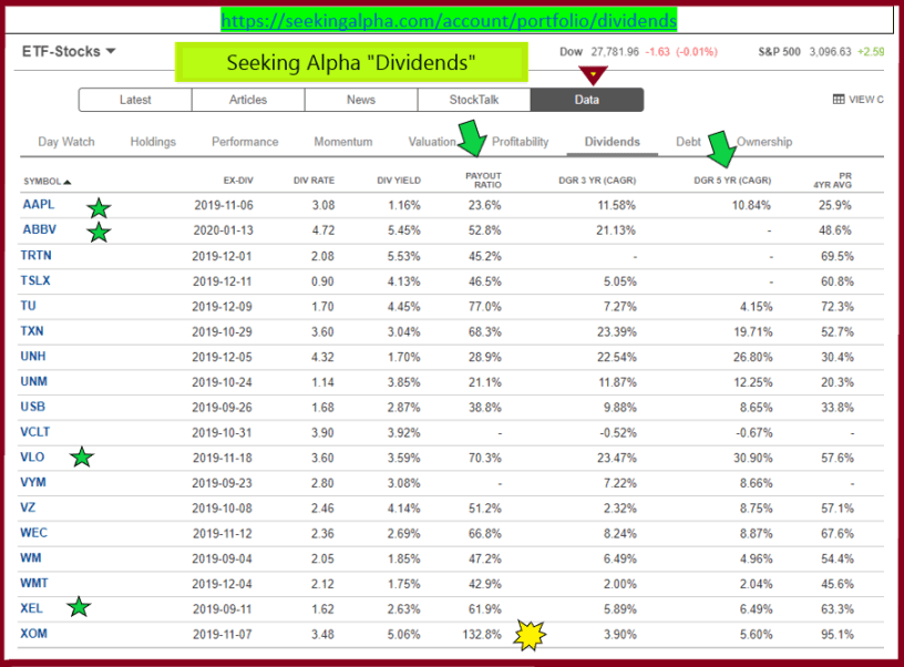 The main image above shows some of our investments. Some of our largest holdings are AAPL, ABBV, VLO, VYM and XEL. These are technology, health care, energy, ETF and a utility. Because I have entered our holdings in Seeking Alpha (the free version), I can quickly review our investments and verify that they continue to meet my requirements. Notice that XOM may be a danger point given the high payout ratio. When I buy a stock like Apple (AAPL), I always want to know these, in this order of importance: