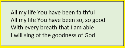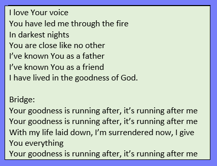 If you want to listen to the song on YouTube, go to this link: The Goodness of God https://www.youtube.com/watch?v=n0FBb6hnwTo&vl=en-US