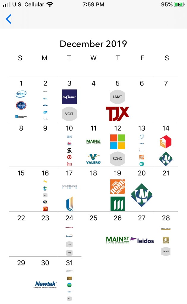 One of the best features of the Dividend Tracker iPhone app is the dividend calendar. I can quickly see which investments are paying a dividend during the month. It is also possible to drill into a single day to get a better view of the companies paying a dividend. For December 13th, for example, I have several positions in my IRA that will pay a dividend. In the image above the left side shows the full calendar for December. When I select December 13, I see the dividends for that Friday as shown on the right side of the image.
