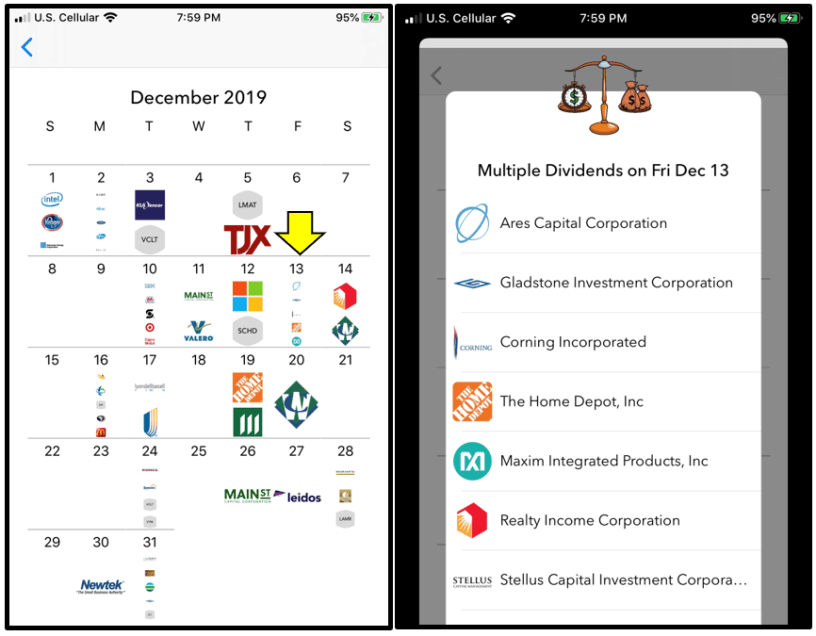 One of the best features of the Dividend Tracker iPhone app is the dividend calendar. I can quickly see which investments are paying a dividend during the month. It is also possible to drill into a single day to get a better view of the companies paying a dividend. For December 13th, for example, I have several positions in my IRA that will pay a dividend. In the image above the left side shows the full calendar for December. When I select December 13, I see the dividends for that Friday as shown on the right side of the image.