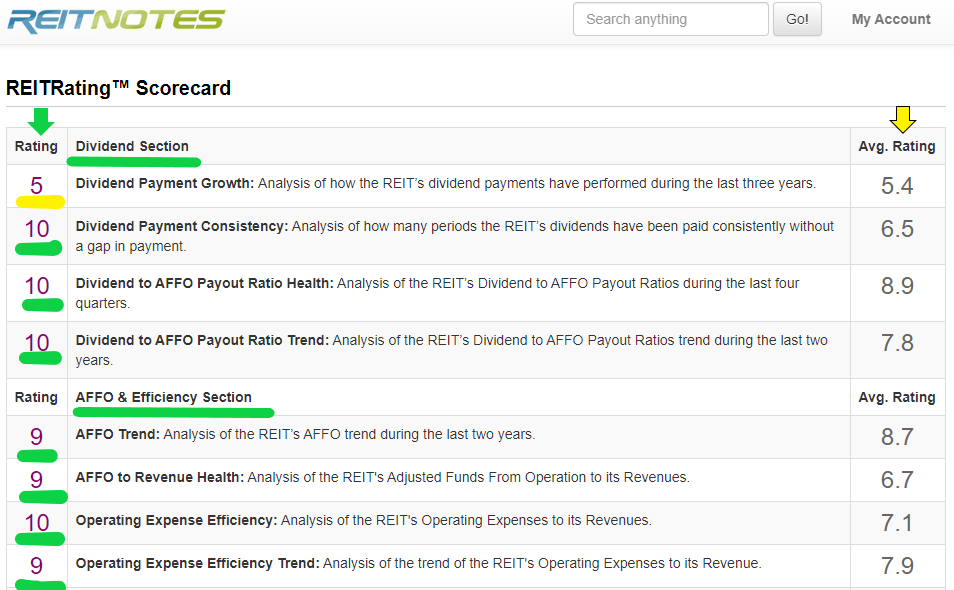 One free web resource that is helpful is called REITNOTES. When you sign up for a free account you can look at any publicly traded REIT to see various metrics. For example, you will see a “REITRATING™”, a stock chart, highlights for the trading day, dividend information, latest news headlines, Funds from Operations (FFO), Key stats (including the P/E ratio), the latest REIT community comments, a summary of the properties owned by the REIT, the occupancy rate (are their properties fully utilized?), the dividend history, the balance sheet, the income statement, cash flow and a very helpful rating scale that compares the REIT you are considering with the “average rating.” At the bottom there is even a “related REITs section, but that is of questionable value, in my opinion.