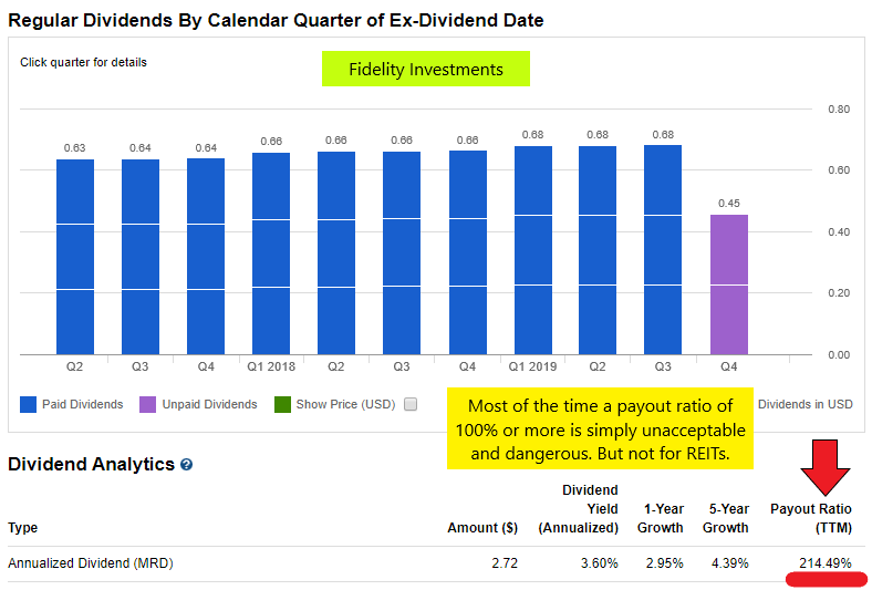 When you buy a REIT investment, some of the value and dividend metrics you would use for a “normal” stock do not work for the REIT. That is because REITs are different from most other investments. For example, the dividend payout ratio is meaningless and worthless on the Fidelity Investments web site. The reason is a bit complicated, so I won’t go into the details. Just understand this: for a REIT investment you don’t compare the dividend to net income. Instead, the comparison must be with a value known as FFO. FFO is the abbreviation for Funds From Operations. Even then, REITs have higher than “normal” payout ratios when using FFO as the value. It isn’t uncommon for the FFO payout ratio to be 70-80%. This isn’t bad by itself.