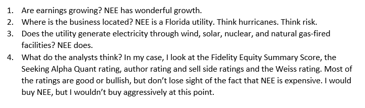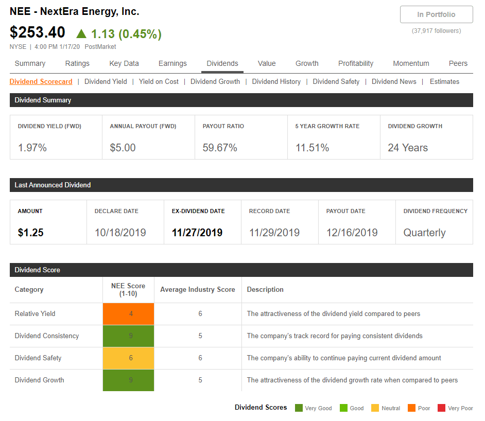Then notice some information on this Seeking Alpha screen. The payout ratio for NEE is considerably less than most utilities. This means there is room for even more growth in the dividend, assuming NEE prospers in the future. NEE has also been increasing dividends for 24 years. This means the business has an admirable track record for increasing dividends.