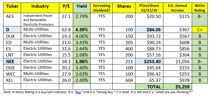 The average person might look at this list and want to buy Dominion Energy (D). A dividend yield of 4.39% is very attractive in a low-interest-rate environment. We have 100 shares of D. But we have more than twice as many shares of NEE which only pays 1.98%. I addition, the price of shares of D is much lower than NEE’s per share price. I could buy more shares of D for the investment I have in NEE and generate more income. Why do I have a greater investment in NEE?