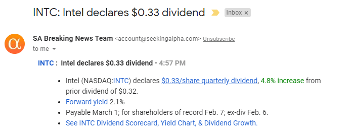 Intel Corporation Dividend Increase News: To make the story even sweeter, Intel increased their dividend. The new quarterly dividend is $0.33/share. This is a 4.8% increase from prior dividend of $0.32. We own 523 shares of INTC.