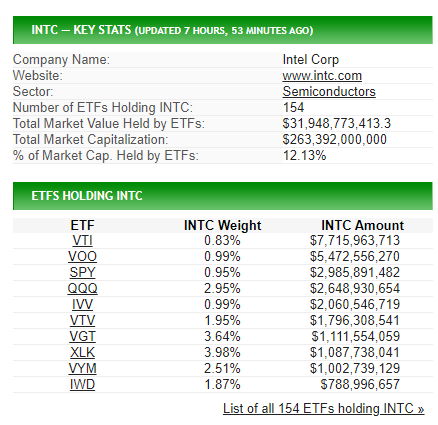 ETFs with INTC – If you own an ETF you probably have a small slice of INTC. Here are some of them, including VYM.
