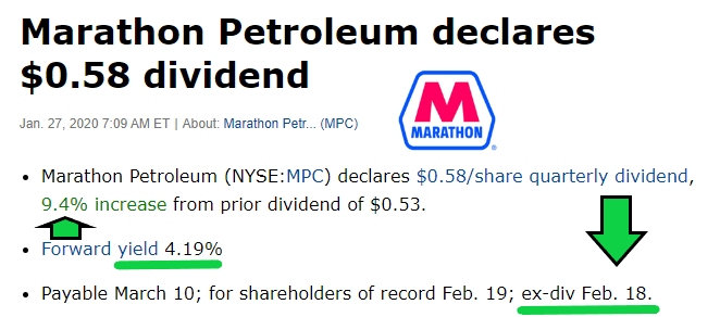 Here is a view from Seeking Alpha regarding MPC’s dividend. Note the yield based on the closing market price, the payout ratio based on earnings, the 5-year growth rate and the number of years the dividend has grown. A payout ratio of 51.5% is sensible in my opinion.