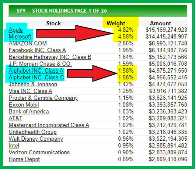 Most investors like mutual funds and low-cost ETF investments because they often invest in many companies. But don’t assume you are getting equal pieces of 500 companies if you invest $500. For example, ETF SPY (SPDR® S&P 500 ETF Trust) holds 506 companies. If you invested $506 in this fund, you don’t have a dollar invested in each company. You would have about $24.39 invested in Apple and $23.17 in Microsoft. The top two companies are almost one-tenth of your total invested dollars. You would also own a portion of eBay. But your total investment in eBay would be $0.50. If you own three different funds, and all of them have AAPL and MSFT in their list of investments, you will own more of Apple and Microsoft than you might want to have. Also notice in this illustration that SPY really holds 3.16% or $16/share of Google (Alphabet Class A and C) shares. In addition, realize SPY has quite an investment in technology companies. At least seven of the top 20 investments are technology-focused investments. SPY is diversified, and it is a credible investment, but be thoughtful if you buy it and other mutual funds or ETFs.