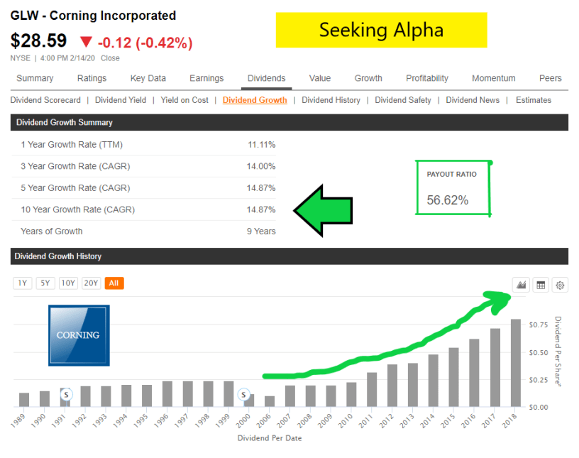 When buying a dividend investment, always check the dividend payout ratio. I think GLW’s payout ratio is acceptable and sensible. They keep some of the earnings for other business purposes including research and development.
