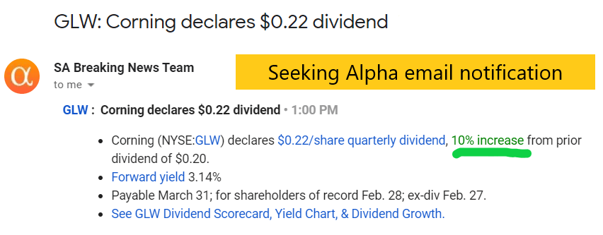 One of the nice things about the Seeking Alpha website is that you can create a portfolio to get news updates via email. Because I added GLW to my portfolio, I received a message alerting me to the dividend increase. This is an opportunity message as well. I might buy more shares based on the improving dividend.