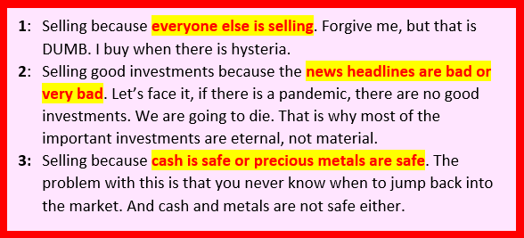 If you missed the previous five rules, here they are. Some might say that rule number three is applicable to the recent panic associated with the coronavirus. The problem is that you can’t sell before others panic. They already have panicked, so the best you could do is join in their panic.