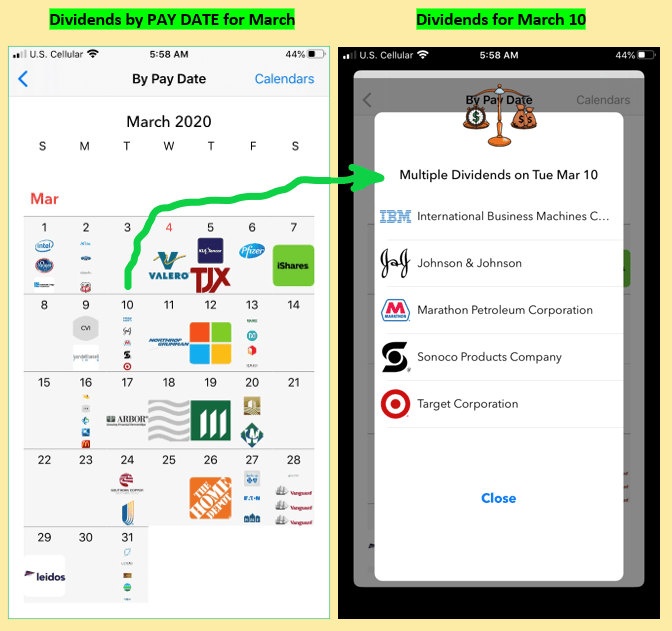 For example, the view below shows my traditional IRA March 2020 incoming ETF and stock dividends by pay date. On the left the entire month is displayed. On the right you can see a better view of March 10th. On the tenth I will receive dividends from IBM, Johnson & Johnson, Marathon, Sonoco and Target. I can then plan to use the cash or reinvest as I see fit.