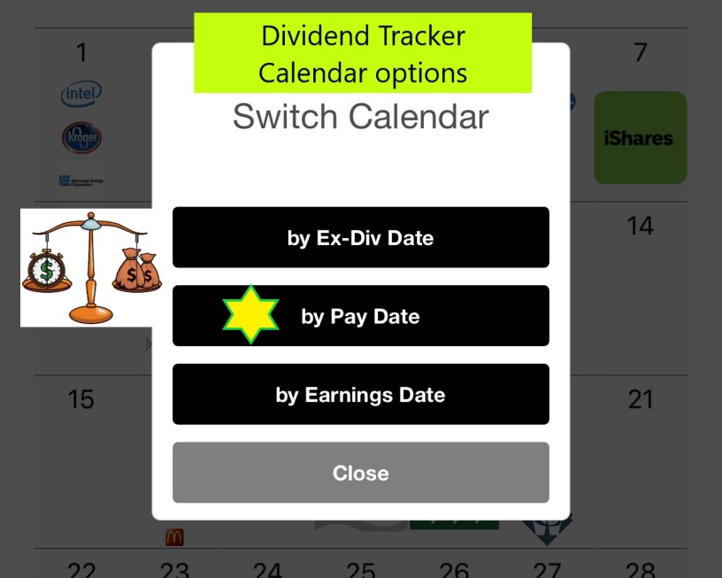 - The best is saved for last. There is a nice calendar feature that shows, my month or by day some vital investor information. You can view your positions by Ex-Dividend Date, Dividend Pay Date or by Earnings Date.