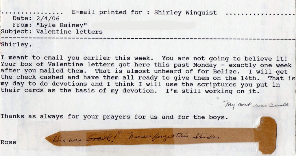 Now let me share what we discovered in the second book. Mom had printed an email from one of the boy’s school in Belize where she had gone on a mission trip with others from her church in Waukesha. The email was a thankyou from Rose for a package and check mom had sent to the school to encourage the boys on Valentine’s Day. This was a reminder that Mom did not just care about someone when she was with them, but continued to care days and years later.