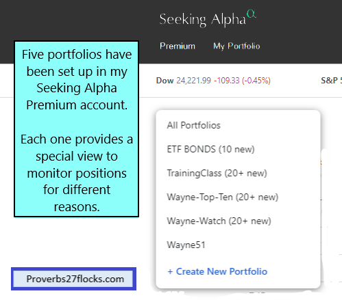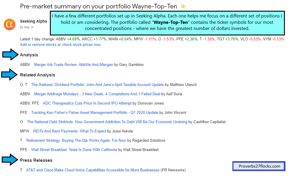 Because I invest in individual stocks (and some dividend growth ETFs), I want to have a focus watch list on the top ten investments in our overall portfolio. Currently our top ten list includes ABBV, ARCC, MAIN, MPW, O, PFE, T, VLO and VYM. VYM is the only ETF in the top ten. This watchlist gives me ratings changes, press releases and various analysis posts from Seeking Alpha authors.