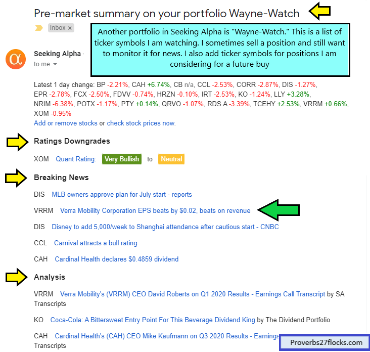 As noted above, I set up a watchlist to watch stocks that I may have sold and want to monitor or (primarily) stocks I might want to buy if the opportunity seems ripe. For example, I have VRRM in my special watchlist called Wayne-Watch because I may buy shares of Verra Mobility Corporation based on potential growth even though VRRM does not pay a dividend.