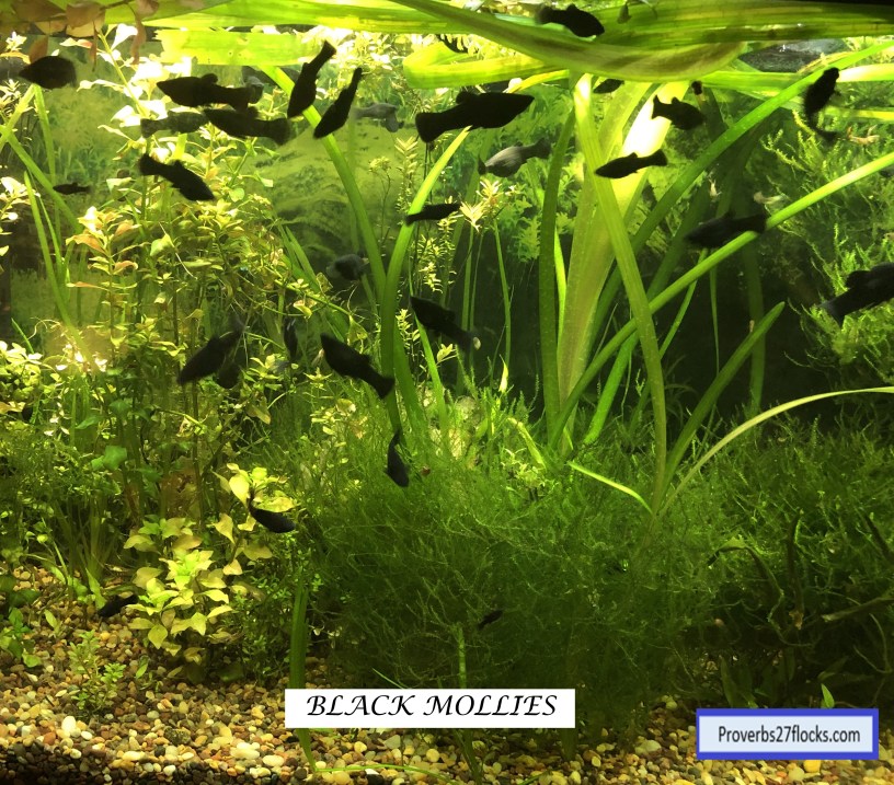 Protecting smaller fish is another distinct advantage of a planted aquarium. Java moss is very hardy and it is a wonderful protection for baby fish. My black molly babies (Poecilia sphenops) find protection in the dense plant. The black molly is also a wonderful algae-eating machine. Mollies and from Mexico and they inhabit freshwater streams and coastal brackish and marine waters. Although I don’t add non-iodized salt to my freshwater aquariums, mollies can benefit from salty water. A brackish water aquarium is an aquarium where the water is semi-salty.
