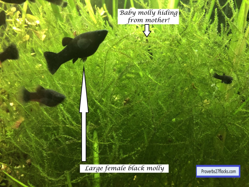 Baby fish face several dangers. One of them is a lack of food. Like most youngsters, baby fish need more frequent feeding than the parents do. But the food is scarce if the parents gobble it all up before they get their share. Food that drifts into the java moss becomes a longer banquet for the small fish. Another big danger is the parent fish. Most livebearers love to eat their young. Providing some protection increases the survival rate of the small newborns.