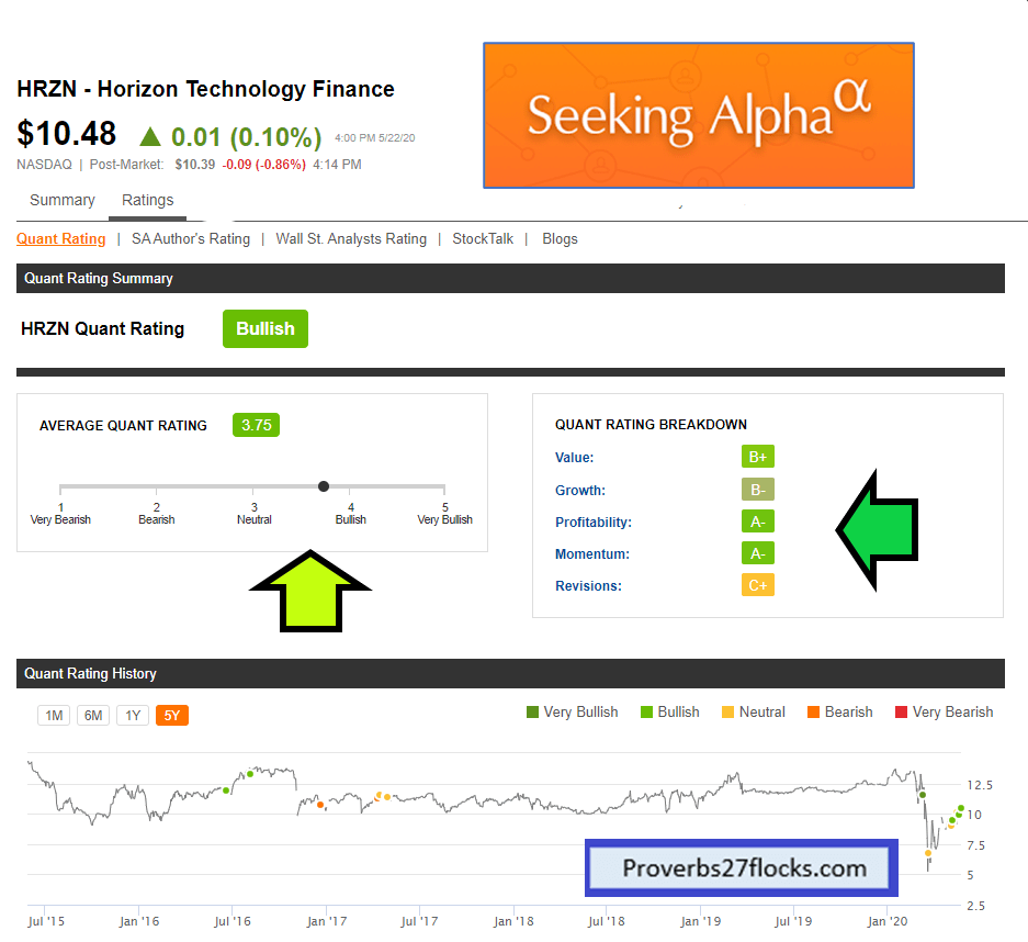 Here is HRZN’s current Seeking Alpha QUANT rating. “Quant Ratings: An overall rating for each stock based on objective data, optimized for predictive value. Seeking Alpha’s Quant Ratings are generated by comparing over 100 metrics for each stock to other stocks, and ranking the stock accordingly.” – From Seeking Alpha This is a link to HRZN’s investor relations page: HRZN