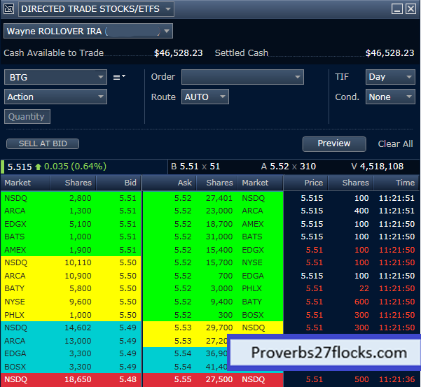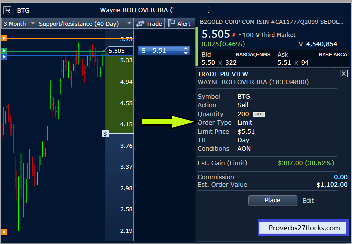 The best way to illustrate my method for completing the sale of a short-term position is through pictures. The following illustrate how I sold my BTG shares yesterday.