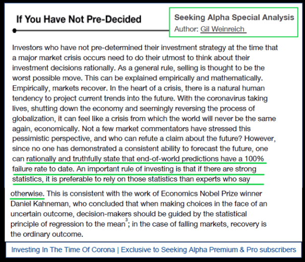 On April 6th I read a Seeking Alpha report by Gil Weinreich. The subject was “Investing in the Time of Corona – How Do We Engage High-Market Volatility?” I had earlier responded in the Fidelity community that one of our recent activities was to support a Christian camp with a gift because they were being hit with reduced retreats leading up to the summer programs. The cancellations of the retreats impacted the camp’s income and their ability to make payroll. Weinreich observed something that many forget. He said, “…end-of-the-world predictions have a 100% failure rate to date.” He then suggested it is best to rely on statistics (when/if available) than leaning on the advice of experts who say otherwise. Here is a section of the report where he states this view: