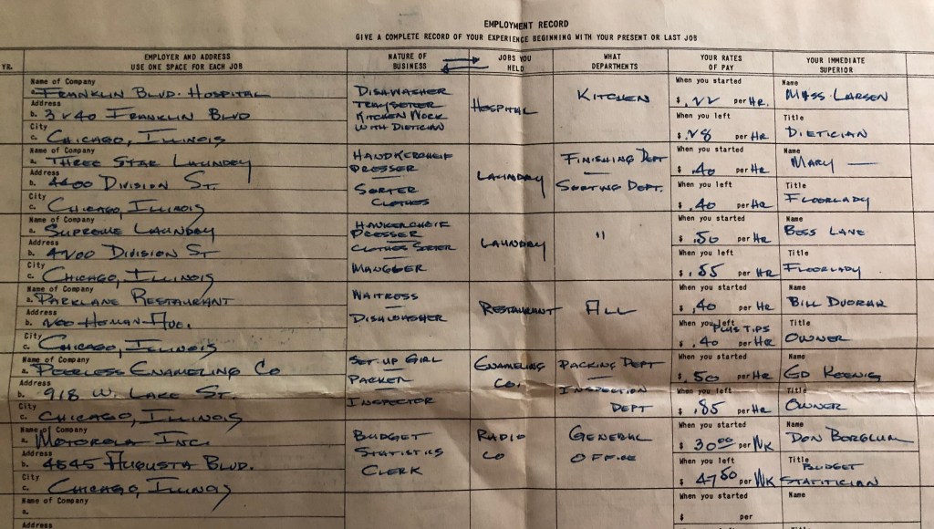 Her final job on the application for employment that I discovered, was for Motorola Inc. She worked as a “budget statistics clerk” and she progressed from $30/week ($0.75/hour) to $47.50/week ($1.19/hour.) All of this had to be before she opened her store when she was 22 years old.