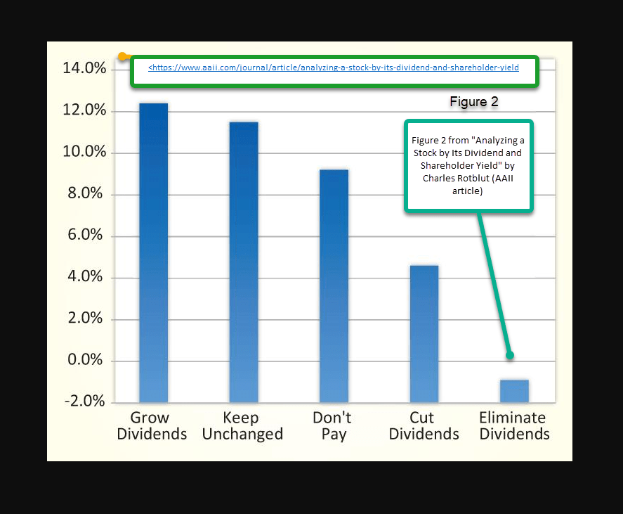 Charles Rotblut (AAII) discussed the problems some companies face and what the company usually has to do to stay solvent. He said, “Should those problems result in the dividend being cut, the return suffers. Ned Davis Research calculated that shares of dividend cutters realized a 4.6% annualized return from June 1994 through February 2016 compared to a 12.4% annualized return for stocks where the dividend was raised (“Investment Strategies for Non-Dividend Payers,” March 2016). Eliminating the dividend is even worse, with such stocks incurring a –0.9% return. Figure 2 shows the return differential between stocks with rising dividends and those with flat or cut/suspended dividends.” – Analyzing a Stock by Its Dividend and Shareholder Yield, by Charles Rotblut. I am including Figure 2 so that you can see the comparisons. (AAII is the American Association of Individual Investors.)