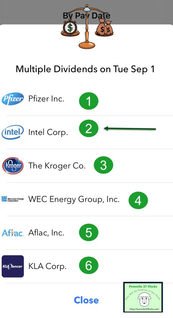 The following images from my iPhone illustrate the power of drilling into the Dividend Tracker calendar options. I selected September 1, and there are six dividends to be paid on this date for PFE, INTC, KR, WEC, AFL, and KLAC.