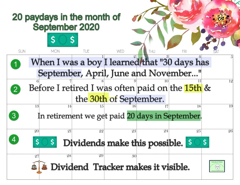 When I started working, most of my employers paid me twice each month. In September it was usually the 15th and the 30th. That was nice, but it would have been great to get paid weekly. Now, however, Cindie and I are paid more often than that. During September 2020 we will be paid dividends on two thirds of the days of the month. That is 20 days of income.