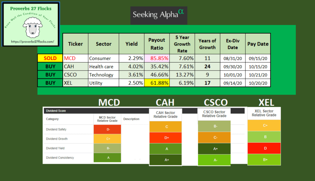 According to the information on Seeking Alpha, the methodology for the Quant Dividend Grades is based on comparisons within a sector. Therefore, in my buys and sells, it isn’t totally fair to compare MCD, CAH, CSCO and XEL. Nevertheless, so that you can see the ratings, I captured them for the following image. Here is the full text from the SA information on the four Quant Dividend Grades: “Seeking Alpha’s Quant Dividend Grades provide an instant characterization of each stock’s dividend strength or weakness compared to its relative sector. Dividend Safety measures profitability and leverage metrics. The Yield Grade measures historical and consensus estimated yield. Dividend Growth measures historical and estimated growth rates. Dividend Consistency measures how consistently the company has paid a dividend and raised its dividend. In combination, the Dividend Grades help investors assess if the dividend is safe and if income will be stable, increase, or decrease.
