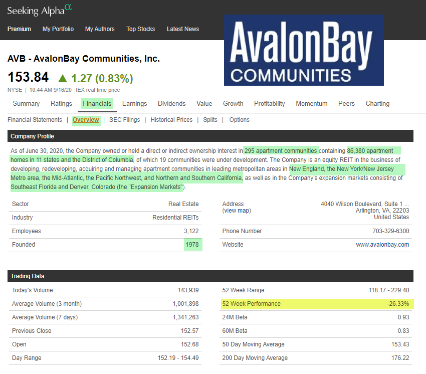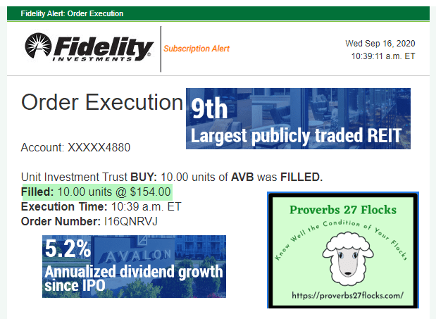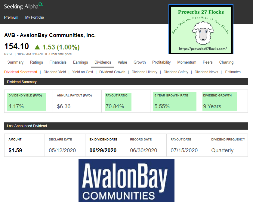 I now hold 85 shares of AVB. I will buy more shares if the price continues downward. AVB announced their next quarterly dividend September 16, 2020. The Ex-Dividend Date is September 29, 2020. I’d like to be at 100 shares by that date.