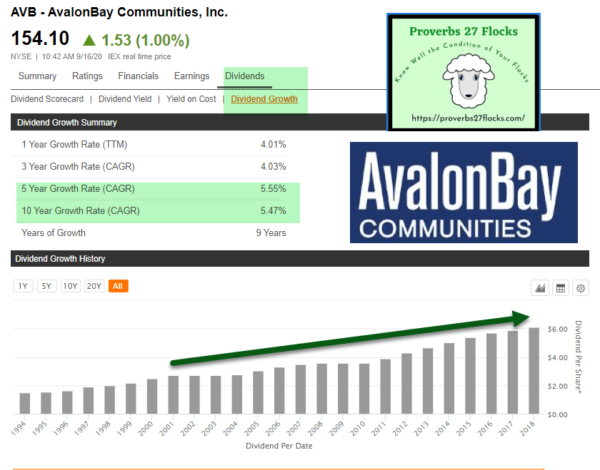 In my recent posts I have talked about the tools I use at Seeking Alpha when I am buying investments. Adding shares of AVB is no exception. Even though I already own shares, before I buy more, I do the same check of some key factors. The images that follow are crucial in my evaluation process. I want growing dividends, a sensible FFO for all REIT investments, and I want a company that is likely to be in business ten years from now.