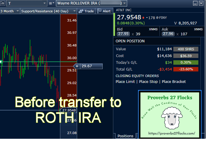 This morning I called Fidelity Investments and asked them to transfer my 400 shares of AT&T (ticker T) from my traditional rollover IRA to my ROTH IRA. This means I now have 1,600 shares in my ROTH. I don’t hold AT&T as a growth investment, but I love the steady flow of dividends, the high yield, and the general long-term growth of the dividend. AT&T can provide cash for many things, including charitable giving. Because we increased our giving this year to a couple of different worthy ministries, we have more deductions for our 2020 Federal and state income tax returns. If we can gain additional tax-free income in the ROTH, that provides even more cash flow for charitable giving.