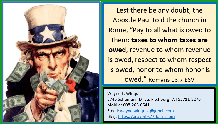 First of all, it is biblical. Matthew 22:21 gives Jesus’ response when he was asked if the Jews should pay taxes to the corrupt Caesar. He asked to see some of their cash. He asked them whose image was on the coin. “They said, ‘Caesar’s.’ Then he said to them, ‘Therefore render to Caesar the things that are Caesar’s, and to God the things that are God’s.’” (God’s image is stamped on you, so you render to God yourself.) Lest there be any doubt, the Apostle Paul told the church in Rome, “Pay to all what is owed to them: taxes to whom taxes are owed, revenue to whom revenue is owed, respect to whom respect is owed, honor to whom honor is owed.” Romans 13:7